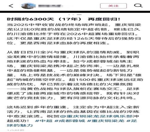 “这场迟到多年的重逢,注定会为中超注入全新活力,让西南足球的热血基因在德比战的淬炼中愈发滚烫。”