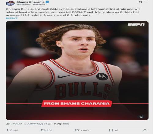 北京时间12月31日上午10点半,据NBA名记Shams报道,芝加哥公牛队后卫约什-吉迪左腿筋拉伤,至少缺席数周的比赛。这对吉迪和公牛来说,无疑是一次沉重的打击。公牛二号得分手科比-怀特右小腿受伤,昨天跟吉迪一起退赛。