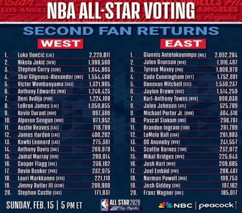 全明星投票第二期:东契奇&字母哥各占头名,詹姆斯升西部第8
