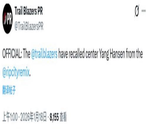开拓者官宣召回杨瀚森!今日有望出战湖人近两场G联赛场均18+12