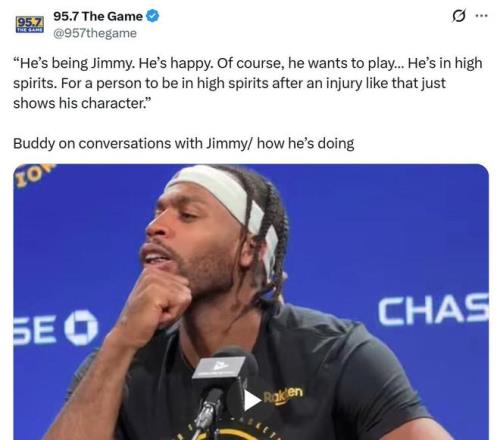 赛后谈及巴特勒受伤后的状态,希尔德说道:“他还是那个吉米,心情依旧不错,当然,他非常渴望登场比赛,但他的精神状态没问题,一个人在经历如此大伤时还能保持这样的精神,这正体现了他的性格。”