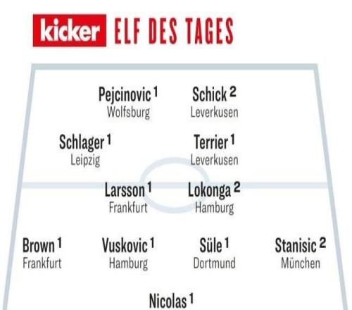 踢球者德甲第15轮最佳阵:斯塔尼希奇、聚勒、希克等球员在列